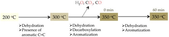 From the quantitative results obtained in this work, the schematic in Figure 8 was postulated for the reaction process of DSE of RS. Specifically, the DSE process was divided by temperature range into three stages: From 200 to 300 °C, from 300 to 350 °C (0 min), and during the prolonged residence time of 60 min at 350 °C. The first stage was characterized by the release of hydrogen bonds via dehydration and the presence of aromatic compounds. The second stage was marked by the removal of the main oxygen-containing groups (H2O, CO, and CO2) through dehydration and decarboxylation, and the occurrence of aromatization. The third stage occurred during the prolonged residence time at 350 °C (0 to 60 min), and was characterized by aromatization and dehydration reactions. At all stages, dehydration and the presence of aromatic C=C groups were observed. This indicates that intramolecular reactions were the predominant mechanism for dehydration in RS DSE. This also signifies that polymerization of RS during the DSE process was suppressed and that the final product is composed of smaller molecular compounds. The suggestion of dehydration along with the observed presence of aromatic C=C bonds at each stage clarified that intramolecular reactions were the dominant process reactions among hydrogen bonds of RS during DSE.