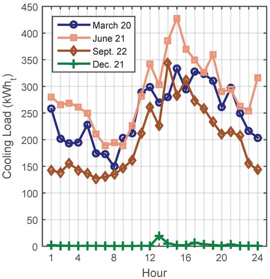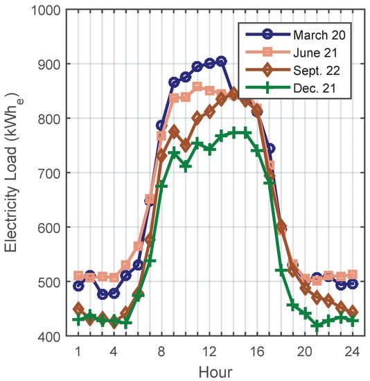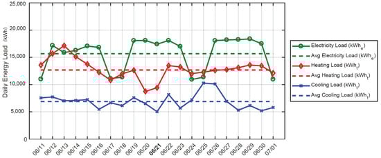 The average energy loads of the buildings comprising the proposed DES are detailed in Table 1. To obtain average energy loads representing the four example days, hourly energy data is taken from 10 preceding days and 10 subsequent days to capture typical load patterns during the time of year around that particular example day. Figure 1 shows the daily energy loads of 21 June and its 20 neighboring days to illustrate the process of obtaining data for the study. Instead of using only the actual energy data for 21 June, incorporating data from neighboring days allows for a representative energy load that includes stochastic variation in the likely energy load on such an example day, which will be discussed further in Section 2.3.1. The data represents the real energy loads in 2017 and is obtained from the university’s SkySpark installation, a building analytics platform that collects building data []. The mean and standard deviation of each set of hourly energy data are shown in the Appendix A (Table A1, Table A2 and Table A3). The average values are plotted in Figure 2, Figure 3 and Figure 4. The daily electricity load is consistent while the daily heating and cooling loads vary throughout the year. The DES is located at Salt Lake City, UT, which is part of American Society of Heating, Refrigerating and Air-Conditioning Engineers (ASHRAE) climate zone 5 (i.e., cool and dry) []. Buildings in this climate zone typically exhibit considerable heating and cooling demands in winter and summer, respectively.