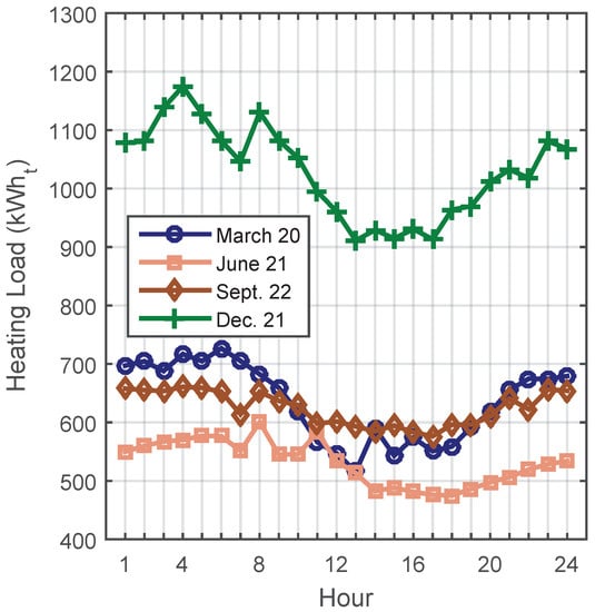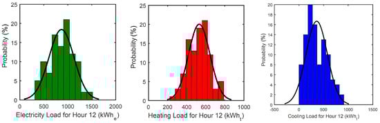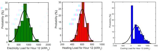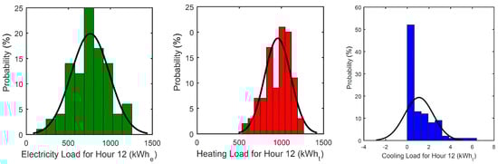 Similar to the uncertainty analysis of wind speed and solar irradiation, the energy loads of the district of buildings are analyzed based on normal distributions. The probability density functions of the loads are similar to Equation (18), while their cumulative distribution functions are similar to Equation (19). Table A1, Table A2 and Table A3 in the Appendix A represent the mean and standard deviation of electricity, heating, and cooling loads, respectively.