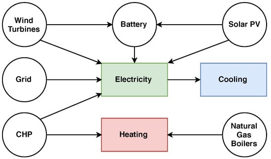 Power generation from distributed energy resources has become increasingly popular []. Traditional power generation is often associated with large-scale power plants [], but distributed power generation tends to occur on smaller scales and is located near the end users. The introduction of distributed generation allows the local energy demand to be less dependent on the grid [] and may provide additional efficiencies by using local energy resources. Renewable energy systems in recent years have been considered within distributed generation systems []. One of the advantages of renewable energy systems is that they can be configured in various system sizes to meet the local energy demand [].