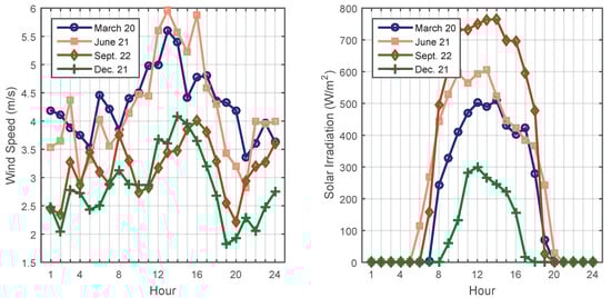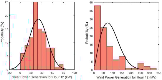 Renewable energy systems in the DES are associated with uncertainties in power generation. For instance, solar PV panels and wind turbines depend on solar irradiation and wind speed, respectively. The uncertainties of these variables can be characterized by statistical probability distributions [,,]. The Monte Carlo simulation is used for modeling and sampling the uncertainties in this study []. This section illustrates the uncertainty analyses of the input variables (i.e., wind speed, solar irradiation, and energy loads). Figure 6 provides the average wind speed and solar irradiation on all four example days. To determine the appropriate statistical distributions, hypothesis tests were used on the actual data. As a result, the uncertainty analysis on the wind speed is conducted based on a Weibull distribution, while the solar irradiation is analyzed based on a normal distribution.