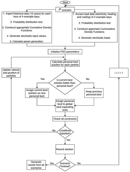 The day-ahead model is optimized by the Particle Swarm Optimization (PSO) algorithm, which was developed by Kennedy and Eberhart in 1995 for studying bird flocking and fish schooling []. This optimization algorithm has been applied in many engineering applications, such as gear train design, process parameter optimization in casting, power generation scheduling, etc. [,]. The population-based optimization has been adopted for the stochastic optimization in this study because it offers mathematical flexibility and computational efficiency to incorporate uncertainties. Figure 7 describes the implementation of the algorithm used in this study. As illustrated in the aforementioned matrix, the PSO algorithm can search for an optimal solution (i.e., minimizing operating cost of the DES at each instant in time) based on the day-ahead model that contains a total of 120 variables. The Monte Carlo simulation method is integrated with the PSO algorithm to assess the uncertainties of renewable power generation and energy loads.