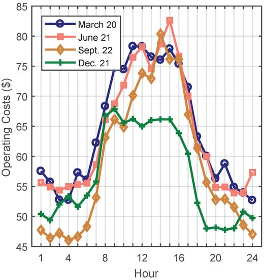 The operating costs for each hour of the four example days are illustrated in Figure 8. Due to the nature of the buildings (offices and classrooms), the majority of the energy use occurs during the day. The operating cost during occupied hours dominates the daily operating cost of the DES. The use of solar PV is beneficial for the DES since the power generation from solar PV panels can be used for fulfilling the electricity load during the day. On the other hand, the power generation from the wind turbines occurs mostly in the afternoon and at night, which can be consumed for night-time building operations and energy storage. The use of solar PV and wind power offers a balance between power generation from renewable energy resources during the day and at night. As a result, the intermittent nature of power generation from each resource can be mitigated. Furthermore, the addition of on-site generation (including wind turbines, solar PV panels, and the CHP system) reduces the dependence on the electrical grid by as much as 26%, as seen in Table 4.