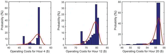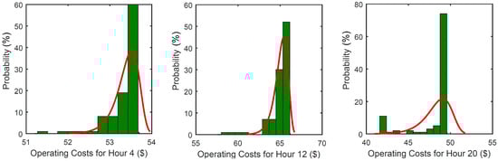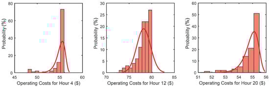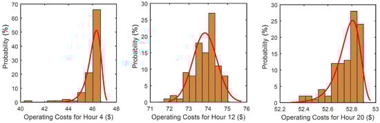 For each hourly operating cost, a probability-normalized histogram is constructed to assess the influence of uncertainties. The operating costs for the three representative hours (4th hour, 12th hour, and 20th hour) in four example days are shown in Figure 9, Figure 10, Figure 11 and Figure 12, respectively. The probability-normalized histograms show the potential operating costs and their probabilities in different price ranges. In other words, the distribution illustrates how probable each operating cost is for the given operating conditions.