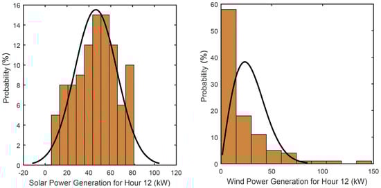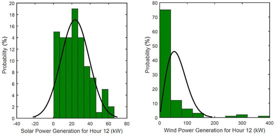 Probability of the power generation from solar PV (left) and wind (right) at the 12th hour on the 22 September case study.