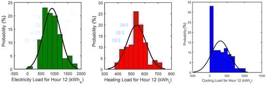 The uncertainties of solar PV and wind power generation drive the uncertainty in power generation overall when using renewable energy resources (Figure 13, Figure 14, Figure 15 and Figure 16). It is important to note that the probability of zero power generation is also included in the plots, which can affect the general distributions. The solar irradiation values are drawn from a normal distribution while the wind speeds are from a Weibull distribution. Consequently, the potential operating costs have various distributions at different hours during the day. For instance, the operating cost follows a normal distribution during hours when the the majority of power generation comes from solar PV panels. Similarly, when wind generation dominates the makeup of electric power provided, the operating cost reflects a Weibull distribution. On the other hand, the effects from other systems are not as pronounced since energy systems such as the CHP generation, the electrical grid, and natural gas boilers are assumed to be readily available when needed. Statistical distributions of all considered power generation methods influence the type of distribution of the operating cost; however, the operating cost probability distribution tends to take the shape of the probability distribution for the source with the most uncertainty. Furthermore, the statistical distributions of energy loads are represented by normal distributions (Figure 17, Figure 18, Figure 19 and Figure 20). The expected energy loads have Gaussian curves that center about their mean values. Therefore, the effect on the operating cost from the expected energy loads are determined by the means and standard deviations of the energy loads. For instance, the high variance (and, therefore, large standard deviation) of the cooling load during early afternoon hours leads to unpredictable cooling demand in those hours.