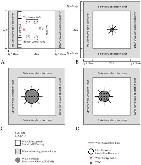 In MILDwave, simulations are carried out in two types of numerical wave basins (see Figure 1A–D) with an effective domain (area not covered by the wave absorbing sponge layers) of 22 m width and 22 m length, and a constant water depth of 0.700 m. The same dimensions are used in NEMOH. Four equally sized effective numerical domains are used. For the simulations performed to obtain the incident wave field, waves are generated using a linear wave generation line located on the left side of the numerical domain with two equally sized wave absorbing sponge layers placed up-wave (left) and down-wave (right) (see Figure 1A).