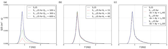 Numerical wave spectrum generated at the centre of the MILDwave numerical domain for an irregular wave with = 1.26 s and = 0.104 m and different simulations parameters: (a) total simulation time, ; (b) number of regular wave components, and (c) grid cell size, . is compared in (a–c) to the theoretical wave spectrum, .