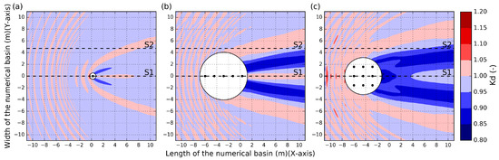 results for an irregular wave with = 1.26 s and = 0.104 m obtained using the MILDwave-NEMOH coupled model: (a) Test Case 2; (b) Test Case 4 and (c) Test Case 6 of Table 1. Contour levels are set at an interval of 0.05 of value (-). The coupling region is masked out using a white solid circle which includes the WECs (indicated by using black solid circles). Incident waves are generated from the left to the right. S1 and S2 indicate the location of cross-sections.