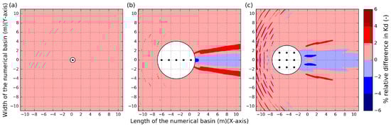 Relative difference (%) in , , between the MILDwave-NEMOH coupled model and NEMOH for an irregular wave of = 1.26 s and = 0.104 m: (a) Test Case 2; (b) Test Case 4; and (c) Test Case 6 of Table 1. Contour levels are set at an interval of 2 of relative difference in value (-). The coupling region is masked out using a white solid circle which includes the WECs (indicated by using black solid circles). Incident waves are generated from the left to the right.