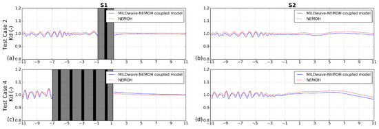 To complete the validation of the MILDwave-NEMOH coupled model, the rest of the Test Cases of Table 1 are presented using the methodology used in Section 5.2.1. Similar conclusions for Test Cases 1, 2 and 5 are drawn: the MILDwave-NEMOH coupled model provides lower results than NEMOH in the wave reflection zone up-wave of the WECs, and increased magnitude of the wake effects down-wave of the WECs indicated by positive and negative values of , respectively.