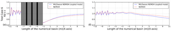 results for the MILDwave-NEMOH coupled model and for NEMOH along two longitudinal cross-sections S1 (left) and S2 (right) as indicated in Figure 3 for: (a,b) Test Case 2; (c,d) Test Case 4, and (e,f) Test Case 6. The coupling region is masked out in gray colour and includes the WECs’ cross-sections, which are indicated by black vertical areas.