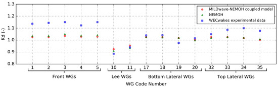 Results for Test Case 6 are shown in Figure 7 and Figure 8 for the 15 WGs shown in Figure 1A. The values from the MILDwave-NEMOH coupled model and from the experimental measurements, and , respectively, and numerical (using MILDwave-NEMOH coupled model) and experimental results of and , respectively, are plotted in Figure 7 and Figure 8. The MILDwave-NEMOH coupled model and the experimental data have a good agreement in the WGs in the lee of the WECs where wake effects take place and in the Bottom Lateral WGs (see Figure 1A) for both the and .