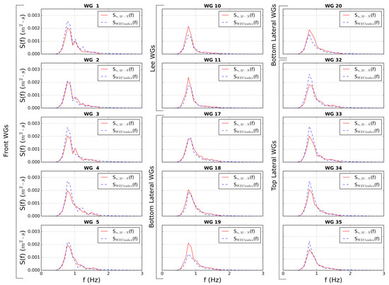 - Spectral density plots comparing the wave spectra between the MILDwave-NEMOH coupled model and the WECwakes experimental data for the 15 WGs.