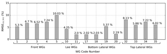 To complete the validation of the MILDwave-NEMOH coupled model against experimental data, the is calculated between the and the for all Test Cases of Table 1. Figure 9 shows the obtained for each WG of Figure 1A. The obtained for the numerical data differs maximal by 10.03% from the experimental data. The ranges between 2.00–10.03%, while the highest agreement is observed at the WGs located in the lee of the WECs and at the Bottom Lateral WGs. The largest are obtained in the front WGs and at the Top Lateral WGs.