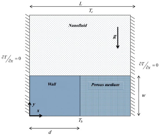 Most of the previous studies have addressed flow and heat transfer in porous media by considering the thermal equilibrium model. Baytas et al. [12] studied the free convection in a porous cavity. They focused on the role of the thermal conductivity of horizontal walls in heat transfer and fluid flow. The results reported by Baytas et al. indicated that the temperature of the fluid-horizontal wall interface decreases with the increase in the thermal conductivity. Baytas et al. [13] examined the free convection heat transfer in a typical cavity containing heat-generating fluid. They found that the height of the step at the interface induces a significant effect on the flow field and heat and mass transfer from the left-hand to the right-hand walls. Additionally, in certain cases, the results obtained by these authors were very well in line with the results obtained by other researchers. Wei et al. [14] investigated the solid-liquid phase change heat transfer in the presence of convection heat transfer in a porous medium using a lattice Boltzmann model. The results showed that the temperature and heat flux continuity conditions at the interface between phases of different thermos-physical properties were inherently satisfied for the model. Chen [15] investigated the lattice Boltzmann model for heat transfer in the porous media. The purpose of this study was to provide a new numerical solution to remedy the shortcomings of previous models. Gao et al. [16] investigated the modified lattice Boltzmann model for conjugate heat transfer in porous media. The numerical results of Gao et al. [16] were in a very good agreement with the analytical and numerical solutions reported in previous studies. The authors argued that the proposed model can be used as a feasible tool for conjugate heat transfer problems in porous media. Miroshnichenko et al. [17] modeled the flow and heat transfer of alumina nanofluids in a cavity composed of two layers of porous media and two layers of clear flows. The outcomes indicated that the thickness of the porous layers and clear layers plays an important role in enhancing heat transfer in the cavity. Dogonchi et al. [18] investigated the MHD natural convection of Cu–water nanofluid in a gap between hot rectangular-cylinder and a cold circular-cylinder filled with porous medium.
