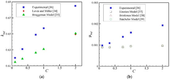 The Levin and Miller [34] and Bruggman [35] models are adopted for the prediction of thermal conductivity of the Al2O3-Cu / water hybrid nanofluid and the results are presented in Figure 2a. The experimental data in [36] have been used as a comparison reference. Considering the dynamic viscosity, the Einstein model [37], Brinkman model [38] and Batchelor model [39] are utilized for the prediction of dynamic viscosity. The experimental results in [36] have also been utilized as a reference comparison. As can be seen, the dynamic viscosity and thermal conductivity of the hybrid nanofluid cannot be predicted properly using the available models. Hence, the experimental data in [36] have been directly utilized for the convection heat transfer analysis of the present study. The experimental results in [36] for dynamic viscosity and thermal conductivity are summarized in Table 1. The hybrid nanofluid sample in [36] was obtained using the hydrogen-reduction technique from a powder mixture containing 90% of alumina and 10% of copper oxide. Based on [36], using ultrasonic and a two-step synthesis method, a stable and uniform suspension of hybrid nanofluids of Al2O3/Cu water with 0.1–2% volume fraction of nanoparticles was prepared. The thermal conductivity of the nanofluid in the present study is directly extracted from Table 1.