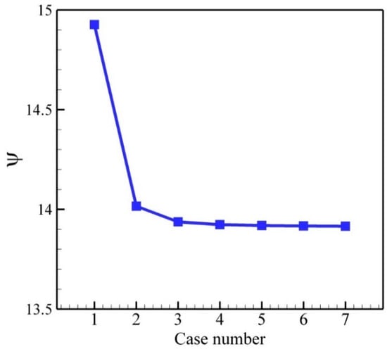 In order to monitor the effect of the mesh size on the accuracy of the results, the calculations are repeated for various mesh sizes. Table 2 shows the details of the utilized grids in each case. The maximum value of the hybrid nanofluid flow stream function (ψmax) is monitored and reported in Figure 3 for each case defined in Table 2. The results of Figure 3 indicates that the grid size of case 4 can provide adequate accuracy with fair computational time. Hence grid of case 4 is selected as the computational grid for this study.