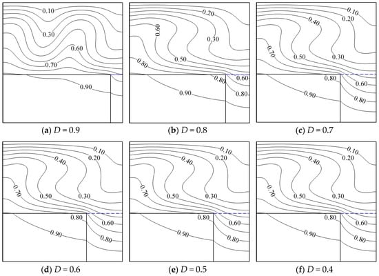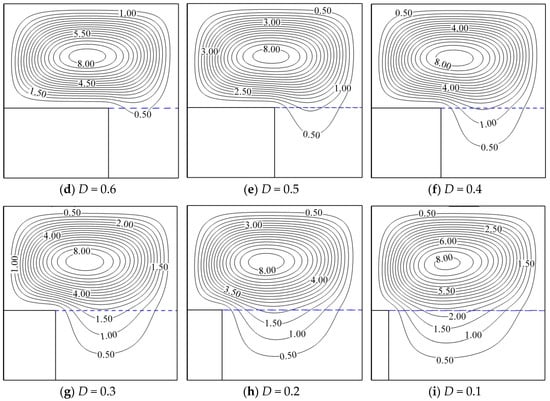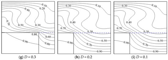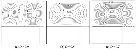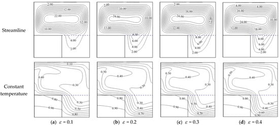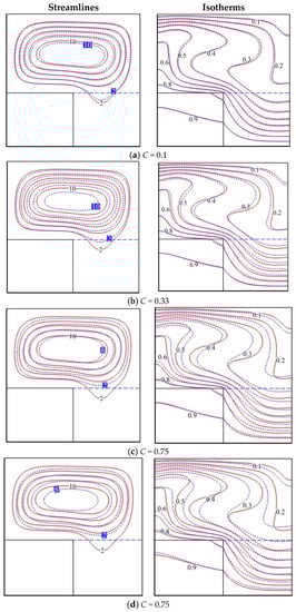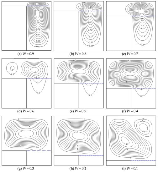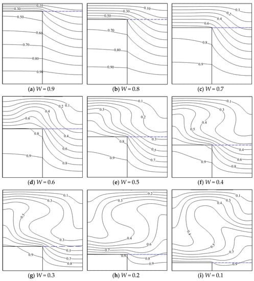 Figure 18 shows the isotherms for different values of the height (W) of the porous and solid media. The above figures are equivalent to Figure 17 and will be compared to them. In Figure 18a, due to the great height of the solid medium, the heat has not been able to penetrate completely into the solid medium and the temperature lines cut it many times. The above figure shows that the upper boundary of the solid medium is at an average temperature (θ) of 0.5. This causes the upper boundary to have a low temperature, and due to its low difference with the cold wall temperature (θ = 0) and the spatial constraints of this region, the lack of fluid circulation in the interface between the solid medium and the cold wall in accordance with Figure 18a is justifiable. However, the point that is important in Figure 18a is the great height of the solid medium and its relatively high temperature compared to the circulating nanofluid, causing the formation of the heat transfer from the adjacent side in the half of the cavity. It is important to consider how the heat transfer occurs in the cavity in these conditions. By continuing the decrease in the parameter W, the solid and porous media becomes smaller, causing an increase in the space for the nanofluid to circulate at the top of the cavity. This has led to a change in the isotherms considering the flow regime in the cavity. Finally, in the case of W = 0.1, the solid medium is at a completely hot temperature, justifying the failure of the temperature lines to cut the solid medium.