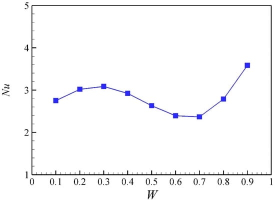Figure 19 shows the Nusselt number for the different values of the height (W) of the solid and porous media. As shown in Figure 17 and Figure 18 for the streamline and isotherms, changes in this parameter result in major changes in the flow regime in the cavity, where only one vortex is formed in the cavity, or two vortices are formed in the cavity at some values of W. However, the Rayleigh-Benard vortex is formed on top of the solid medium at W = 0.6. Now, we examine the effect of each of the above values on the heat transfer. Figure 19 shows that the maximum Nusselt number occurs in W = 0.9, where the height of the solid and porous media is such that the nanofluid circulates in half of the cavity. In this amount of W, heat is transferred mainly to the nanofluid not from the bottom of the cavity, but from the solid wall in the vicinity of the nanofluid. However, the minimum Nusselt number occurs in W = 0.7. On the other hand, an acceptable Nusselt number is obtained where W = 0.1. At this amount of W, the height of the solid and porous media is minimized and the nanofluid-filled medium has a large volume. The reason for this is the increased volume of the nanofluid portion which has greater space in the cavity for the fluid circulation with the decreased height of the solid and porous media (especially the solid medium), making it easy to circulate fluid, increase fluid velocity and consequently increase heat transfer.