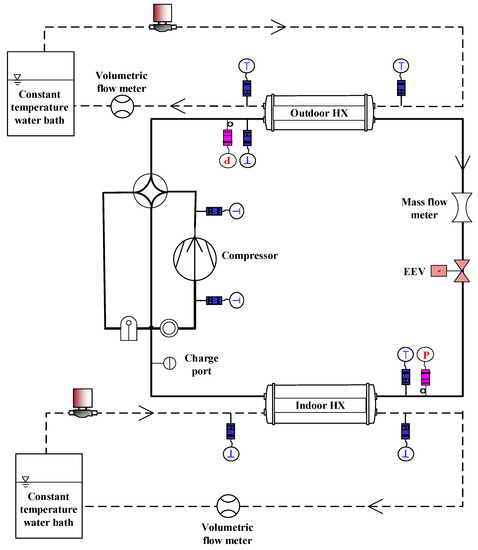 R410A was used as a refrigerant in the heat pump unit with closed loop water flow paths used as secondary fluid flow loops for the OD HX and ID HX. Constant temperature water baths with 45% ethylene glycol concentration were used to simulate the secondary fluid flow loops. The ethylene glycol solution was selected as the secondary fluid due to the simplicity in its capacity measurement. The flow rates of the ethylene glycol in the ID HX and OD HX were controlled using an inverter driven pump.