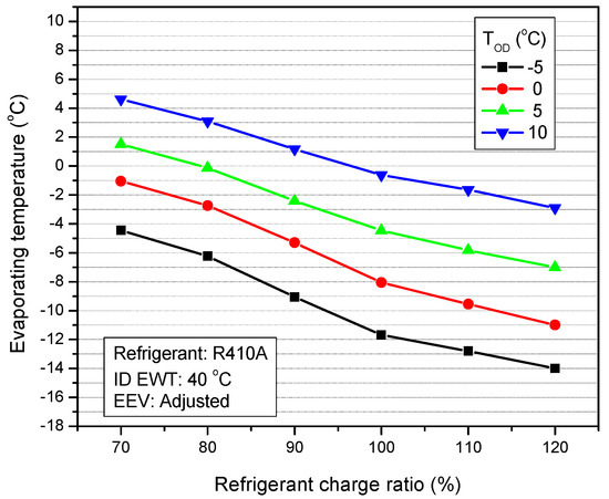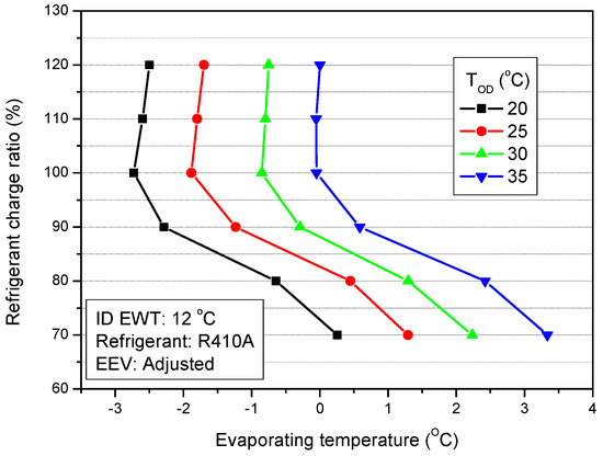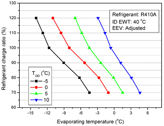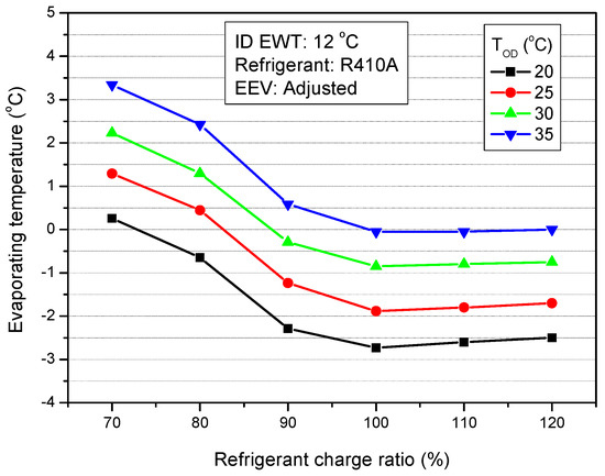 Relationship between the refrigerant charge ratio and evaporating temperature in cooling mode.