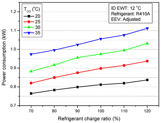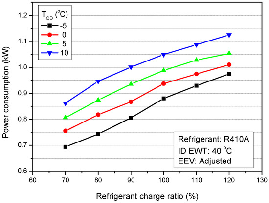 Figure 16 shows the COP of the heat pump as a function of the refrigerant charge ratio and . The COP decreased significantly at undercharge conditions and slightly at overcharge conditions at all conditions. The power consumption of the heat pump decreased at undercharge conditions, as shown in Figure 17. This is due to decrease in the pressure ratio of the heat pump unit at undercharge conditions. However, the slope of decrease in the power consumption was smaller than that of the heating capacity, resulting in the decrease in COP. At overcharge conditions, power consumption increased because of an increase in the pressure ratio that caused a decrease in the COP at all . At the standard , the COP decreased by 6.5%, 23.0% and 52.9% at 90%, 80% and 70% RCR respectively. At overcharge conditions, the COP decreased by 2.4% and 5.5% at RCR of 110% and 120% respectively at the standard condition.