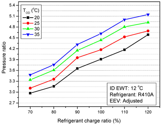 Figure 5 represents the COP of the heat pump with variation of refrigerant charge ratio and . The optimum refrigerant charge amount (100% RCR) of this study was determined to have the maximum COP. The COP decreased at both undercharge and overcharge conditions with steeper slope at undercharge conditions than at overcharge conditions. This is similar to the COP trend realized in the works of Choi and Choi [4]. COP is defined as the ratio of the cooling capacity to the power consumption of the heat pump. As shown in Figure 6, the power consumption decreased at undercharge conditions, however the slope of decrease was smaller than that of the cooling capacity at undercharge conditions. Nonetheless, the power consumption increased at overcharge conditions to result in a decrease in the COP at overcharge conditions. Power consumption of the heat pump greatly depends on the compressor pressure ratio and refrigerant mass flow rate. The power consumption was mainly affected by the compressor pressure ratio since the refrigerant mass flow rate remained almost constant with the variation in RCR. Figure 7 shows the pressure ratio with variation in RCR and . The pressure ratio decreased at undercharge conditions and increased at overcharge conditions due to a decrease in the condensing pressure at undercharge conditions and an increase in same at overcharge conditions. The evaporating pressure remained almost constant at both undercharge and overcharge conditions due to the adjustment of the EEV to maintain a constant superheat at all test conditions. The rate of decrease in COP at undercharge conditions was higher than that at overcharge conditions at all conditions. At standard of 25 °C, the COP decreased by 4.9%, 14.3% and 18.0% at RCR of 90%, 80% and 70% respectively; while the COP decreased by 2.2% and 5.0% at RCR of 110% and 120% respectively at overcharge conditions.