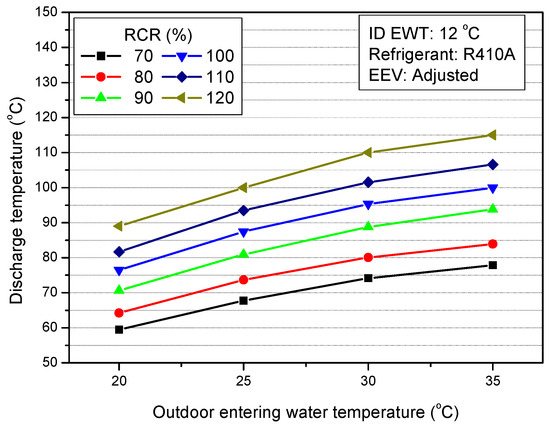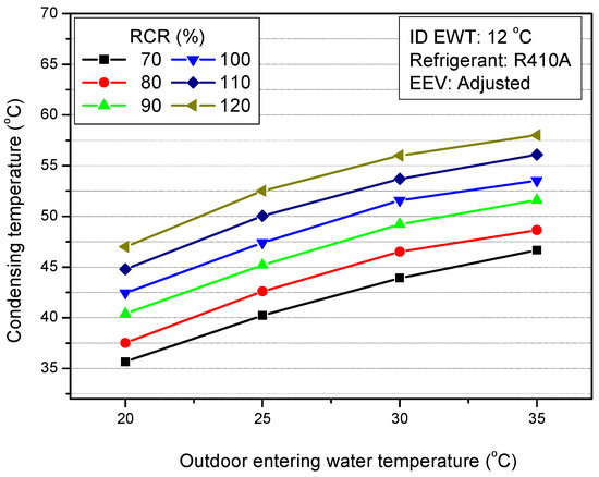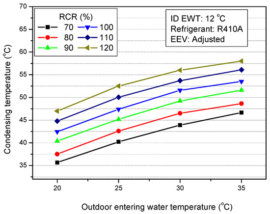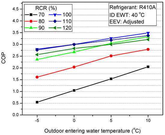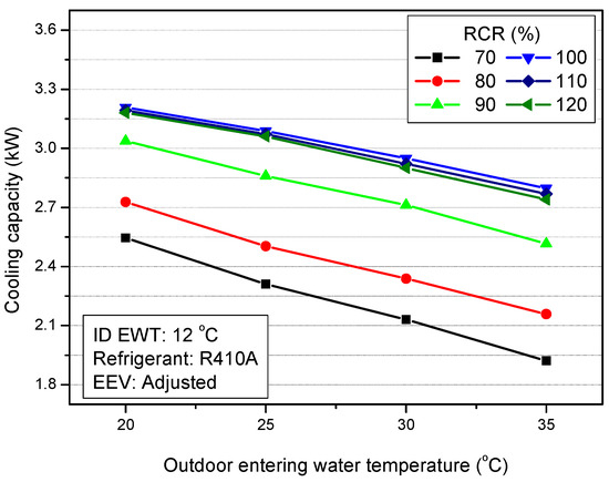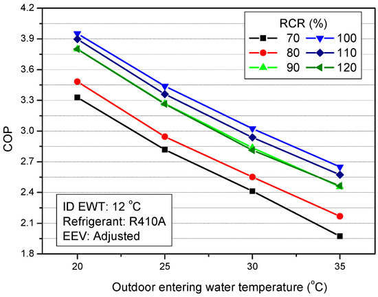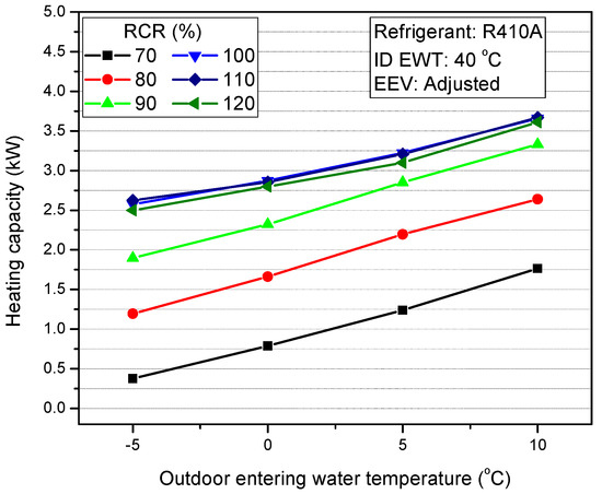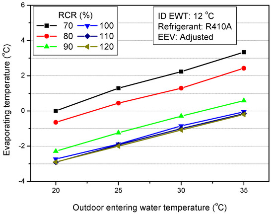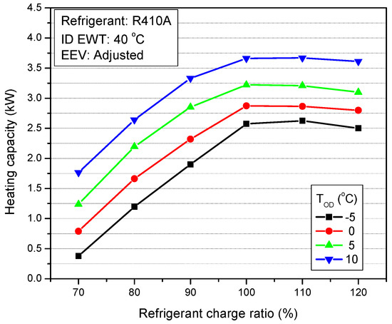 Figure 13 shows the effect of refrigerant charge ratio (RCR) on the heating capacity of the heat pump at various outdoor entering water () conditions. The heating capacity sharply decreased at undercharge conditions and decreased slightly at overcharge conditions at all . This is similar to the trends realized in the works of Zhang et al. [2] and Chae and Choi [15]. At undercharge conditions, the temperature difference between the refrigerant and secondary fluid in the OD HX decreased due to decrease in the heat transfer rate between the refrigerant and secondary fluid. This caused an increase in the evaporating temperature at undercharge conditions as shown in Figure 14. Also, refrigerant mass flow rate increased at undercharge conditions due to an increase in the EEV opening to maintain a constant superheat as shown in Figure 15. The EEV opening has a significant effect on the refrigerant mass flow rate of the heat pump [2]. However, the effect of the decrease in heat transfer rate in the OD HX was greater than the increasing effect of the refrigerant mass flow rate. This caused the heating capacity to decrease at undercharge conditions. At overcharge conditions, the refrigerant mass flow rate decreased while the heat transfer rate in OD HX increased. The combined effect caused the heating capacity to decrease. The heating capacity decreased by 11.5%, 31.9% and 61.6% at 90%, 80% and 70% RCR respectively at the standard condition. At overcharge conditions, the heating capacity decreased by 0.4% and 0.8% at RCR of 110% and 120% respectively at the standard condition.