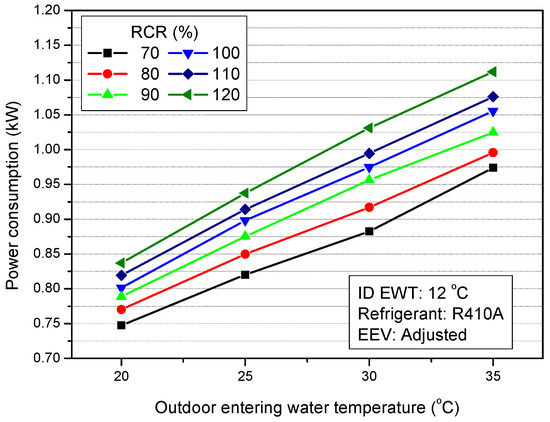 Figure 11 shows the effect of on the COP of the heat pump unit. The COP decreased with an increase in the at all RCR. This is due to a decrease in the cooling capacity and an increase in the power consumption of the heat pump as the increased. Figure 12 shows power consumption of the heat pump with variation in the at all RCR. The increase in resulted in a significant increase in the condensing pressure and a slight increase in the evaporating pressure. This caused an increase in the pressure ratio of the heat pump. However, the refrigerant mass flow rate was almost constant as the increased due to the control of the EEV opening. Therefore, the increase in power consumption of the heat pump was mainly due to increase in the pressure ratio of the heat pump at all RCR. At the optimum refrigerant charge, the COP decreased by 13.0%, 23.5% and 32.9% as the increased from 20 °C to 25 °C, 30 °C and 35 °C respectively.