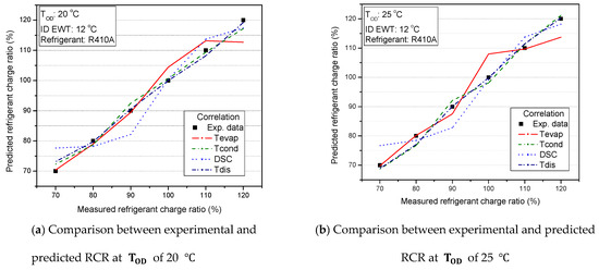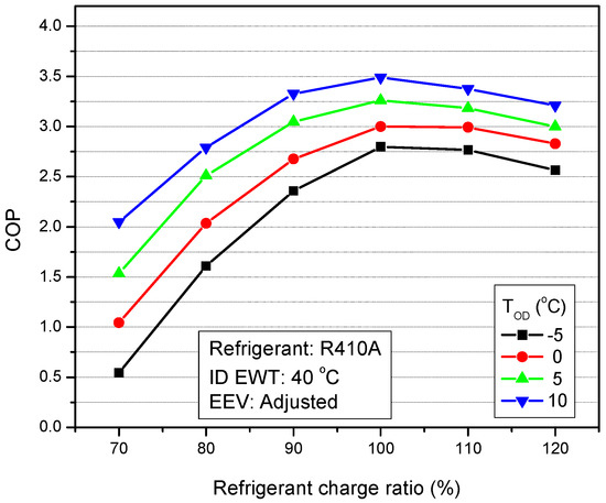 The was varied at each RCR to determine its effect on the performance of the heat pump when it is overcharged and when undercharged. RCR below the optimum charge is referred to as undercharge condition while that above the optimum charge is referred to as overcharge condition. In cooling mode, the was varied at 20 °C, 25 °C, 30 °C and 35 °C, while the was varied at −5 °C, 0 °C, 5 °C and 10 °C in heating mode. Heating mode standard test condition was selected according to ISO 13256-2 [13]. The EEV opening was adjusted during each experiment to maintain a constant superheat of 7 °C.