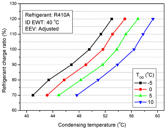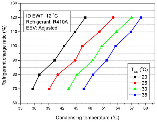 Relationship between refrigerant charge ratio and condensing temperature in cooling mode.