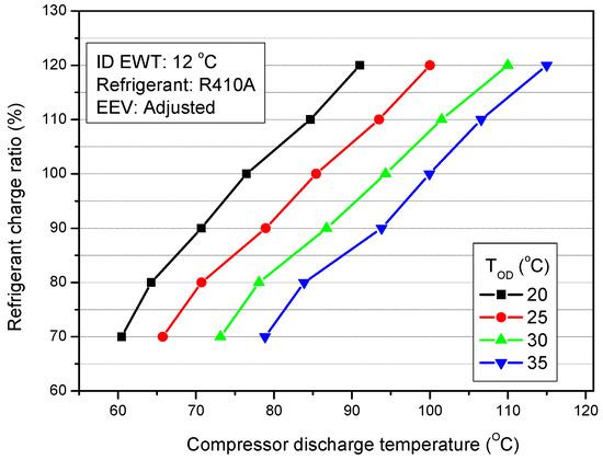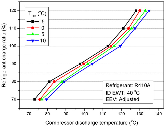 Compressor discharge temperature with variation of refrigerant charge ratio in heating mode.