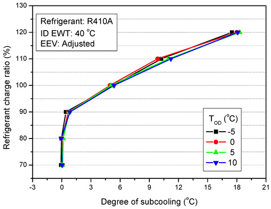 Relationship between the refrigerant charge ratio and degree of subcooling in cooling mode.