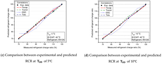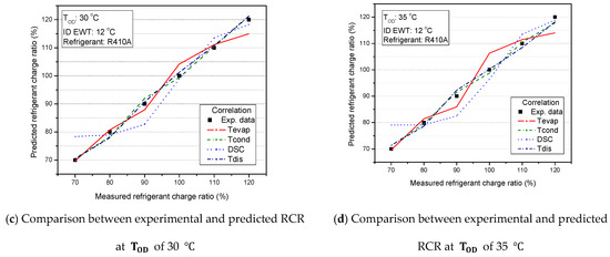 Comparison between experimental and predicted RCR in cooling mode at of (a) 20 °C, (b) 25 °C, (c) 30 °C and (d) 35 °C.