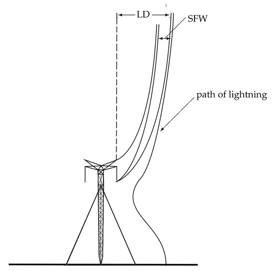 Lateral Distance (LD) and Shielding Failure Width (SFW) are analyzed as illustrated in Figure 1. Lateral distance is the longitudinal boundary width which contains the longest path. SFW is the longitudinal interval which contains the paths that reach the conductors (positive or negative) [24,25].