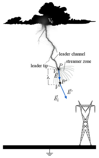 Consider a conventionally uniform positive downward leader as in Figure 2. A positive leader is constituted of a leader tip, a leader channel and a streamer zone [27]. At the leader’s tip, the potential over the point P is V. The downward leader leaps to point in the direction of the streamers of highest current intensity. The voltage drop can be obtained by Ohm’s Law as