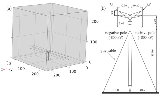 The tower design included in the simulation is a HVDC 800 kV tower (Figure 3b). The tower structure and cables were considered as line segments with negligible thickness. The positive pole of the transmission tower was set at 800 kV, and the negative pole at −800 kV.