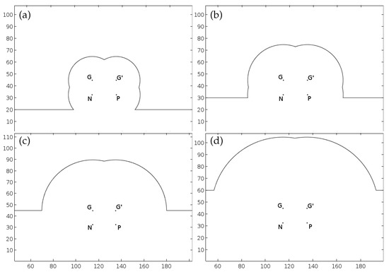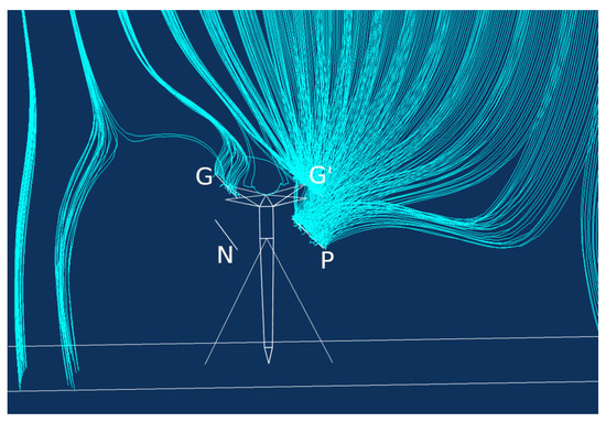 Cross-section of the HVDC line in the middle of the span region. G and G’ indicate the positions of the arrestor cables. N and P indicate the positions of the negative and positive poles, respectively. (a) Conventional topology, (b) Proposed topology. Arrestor cable G was shifted 5 m in the positive direction of the x-axis, while arrestor cable G’ was shifted 9 m in the same direction.