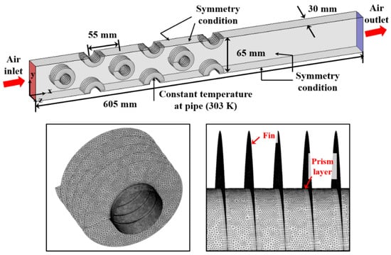 The turbulence intensity is 5% for the Re = 11,440. The tube wall is a no-slip condition with a fixed temperature of 303 K. Shell conduction, which can be used to model the thin wall without constructing mesh for the wall thickness, is employed to calculate the heat conduction within the fin. This model can be applied to the thin wall to consider the conjugate heat transfer [21,25]. The fin is made of stainless steel which has a thermal conductivity of 16.27 W/(m⸱K) and specific heat at constant pressure of 502.48 J/(kg⸱K). The fin thickness is set as 0.4 mm. The outlet condition is atmospheric pressure based on the gauge pressure. The density of the air is treated as an incompressible ideal gas. The thermal conductivity and viscosity of the air are set to piecewise-linear functions of temperature.