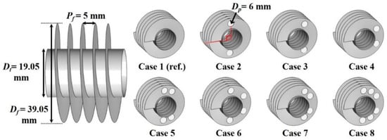 We construct the three-dimensional model and grid system of the spiral finned-tube heat exchanger. A staggered arrangement of tubes with six columns is adopted to analyze the effect of perforation positions on the fins. The distances in the transverse and longitudinal direction of each tube are 65 mm and 55 mm, respectively. The computational domain is extended to remove the backflow effect that is an artificial error at the outlet boundary. The total length of the computational domain is 605 mm, and the width is 30 mm. For the numerical analysis, we construct approximately 11.4 million tetrahedral mesh elements. Five prism layers are constructed on the wall of the fins for a detailed analysis of the flow motions and the heat transfer characteristics close to the fin surfaces. Figure 2 depicts eight fin configurations where the number and location of holes differ. The tube and fin diameters are set at 19.05 mm and 39.05 mm, respectively, the fin pitch is 5 mm, and the size of the hole is 6 mm. Case 1, the spiral fin without perforations, is taken as the reference case. Three locations, at 90°, 120°, and 150° from the leading edge of the tube, are studied. Cases 5, 6, and 7 each have four perforations on the fin per fin pitch, and Case 8 has six perforated holes per fin pitch.