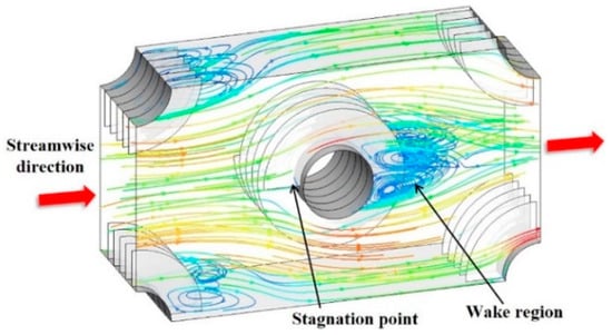 Figure 5 shows the flow characteristics of the finned-tube heat exchanger using streamlines. The stagnation point appears when the main flow encounters the leading edge of the tube. The flow velocity increases on both sides of the central tube with a decreasing cross-sectional area and reaches a maximum value at the smallest cross-sectional area. Also, flow separation is generated that causes a decrease in the heat transfer performance in the rear part of the tube. A wake region with the recirculation flow is observed behind the tube in the streamwise direction. In the wake region, heat transfer occurs owing to the recirculating flow that interacts with the mainstream and finned-tube surface [18].