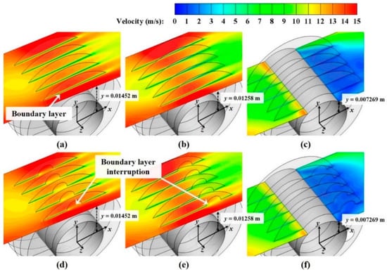 Velocity magnitude distributions with different hole locations at Re = 11,440. (a) Case 1(ref.) at y = 0.01452 m; (b) Case 1(ref.) at y = 0.01258 m; (c) Case 1(ref.) at y = 0.007269 m; (d) Case 2 at y = 0.01452 m; (e) Case 3 at y = 0.01258 m; and (f) Case 4 at y = 0.007269 m.