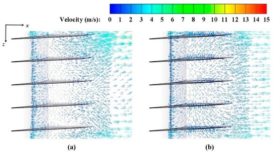 Comparison of velocity vectors at Re = 11,440. (a) Case 1(ref.) at y = 0.007269 m; (b) Case 4 at y = 0.007269 m located in wake region.