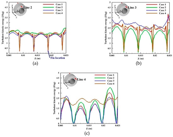 Comparison of turbulent kinetic energy at fixed locations in z-direction at Re = 11,440. Case 1(ref.) is compared with Cases 2, 3, and 4, (a) at Line 2 (y = 0.01452 m), (b) at Line 3 (y = 0.01258 m), and (c) at Line 4 (y = 0.007269 m).