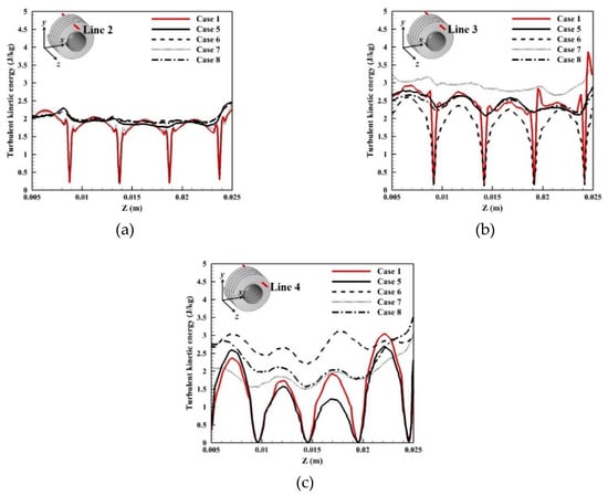 Comparison of turbulent kinetic energy at fixed locations along z-direction at Re = 11,440. Case 1(ref.) is compared with Cases 5, 6, 7, and 8, (a) at Line 2 (y = 0.01452 m), (b) at Line 3 (y = 0.01258 m), and (c) at Line 4 (y = 0.007269 m).