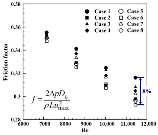 The friction factor is a critical parameter in the design of finned-tube heat exchangers as the pumping power is proportional to the pressure drop [26]. It is associated with the flow disturbance and the surface area of the fins and tubes. The perforations on the fin enhance the flow disturbance, but reduce the surface area. Figure 11 compares the friction factor of the eight cases for various Reynolds numbers. Cases 2, 5, 6, and 8 show almost identical pressure drops, with a difference less than 2%. However, Case 7, showing the greatest turbulent kinetic energy, exhibits a larger pressure drop than the cases with four perforations per fin pitch. The smallest pressure drop is observed for Case 6, showing a maximum difference of friction factor approximately 8% compared to the reference case. It indicates that the skin friction drag of the perforation cases is decreased, because of the smaller surface area, and the flow resistance decreases in the wake region, because the fluid flows well through the perforations that cause the decrease in the pressure drop.