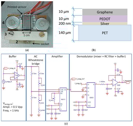(a) The real view of the sensor. The sensor dimensions are: 1.8 cm by 1 cm, with a thickness of about 140 µm. The IDT fingers (1) have a width of 200 µm, a length of 6 mm, a thickness of 200 nm and a track spacing of 350 µm. A customized socket was used to convey signals to the conditioning electronics (2) and blocked by screws (3). Washers and screws (4) have been also used to fix the sensor to the experimental setup; (b) the sensor structure (not in scale) and (c) the electronics adopted for conditioning the CO2 printed sensor.