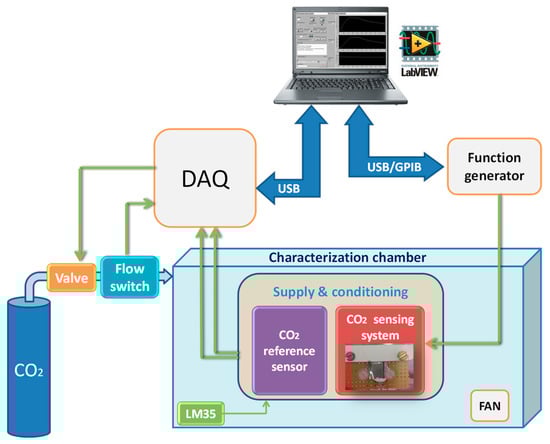 The experimental set-up developed for the sake of the device characterization is shown in Figure 2. The system consists of an insulated chamber with a controlled gas injection system. The chamber is made of PolyMethylMethAcrylate (PMMA) and has a size of 60 cm × 50 cm × 30 cm with a total volume of 0.09 m3. The CO2 injection system is equipped with the flowmeter PFM710 by SMC to monitor the CO2 flux, 3 electrically controlled brass valves by Aquili. The CDM4161A sensor has been used to independently measure CO2 concentration during the experiments. The latter is a low-power sensor (300 mW), with an operating range of (400–4200) ppm.