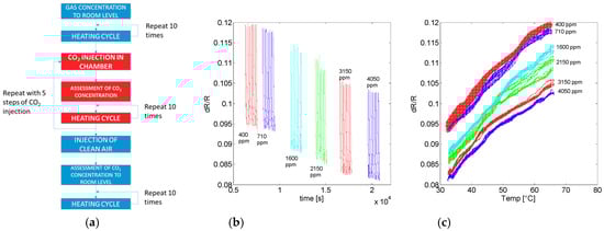 The measurement protocol adopted to operate the printed gas sensor is shown in Figure 3a. The first step consists in conveying clean air inside the chamber up to reach typical environmental CO2 concentrations (around 400 ppm). Afterwards ten heating cycles are performed (the duration of each heating cycle is 150 s), followed by injection of the desired CO2 quantity inside the chamber and successive other 10 heating cycles. For each cycle the sensor is heat up to the desired working temperature. After heating the device, a time interval is waited for reaching a steady state regime. Successively, a new CO2 quantity is injected into the chamber. The procedure ends up when the full scale value of the gas concentration is reached.